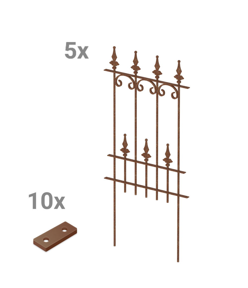 Avec ses décorations artistiques en forme de C et son élégant piquet décoratif en forme de boule de lys, notre modèle de clôture populaire « Lucca » apporte une touche d'originalité à votre jardin. Ce kit de clôture enfichable pratique, proposé à un prix avantageux, comprend cinq éléments de clôture de 50 cm de large et 105 cm de haut chacun (piquet décoratif et ancrages inclus). L'installation est particulièrement simple : les éléments métalliques de haute qualité s'enfoncent simplement dans le sol et se vissent solidement grâce aux connecteurs fournis.